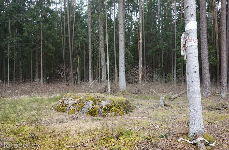 Валун Каменная баба (Святой камень, Окаменелая женщина) расположен северо-западней д. Дубени Борисовского района Минской области, в 0,5 км от оз. Святое, с которым и связана местная легенда об этом камне. Однажды в давние времена в эту деревню забрёл путник (Иисус Христос) с просьбой о ночлеге. Из всех местных жителей только она добрая женщина, вдова с ребенком согласилась принять странника. В благодарность Иисус Христос решил их спасти, следуя на ним и не оглядываясь, что бы не случилось. Но когда за спиной послышались пожар и страшные крики, женщина не удержалась и наклонившись оглянулась, окаменев в тот же миг. По поверью, валун Каменная баба постепенно погружается в землю, и когда он полностью скроется под землёй, то тогда и наступит конец света. Этот валун считается у местных культовым, на ближайшем дереве можно увидеть рушник. Размер валуна приблизительно 4х3 метра. Координаты: 54.334243,28.432873